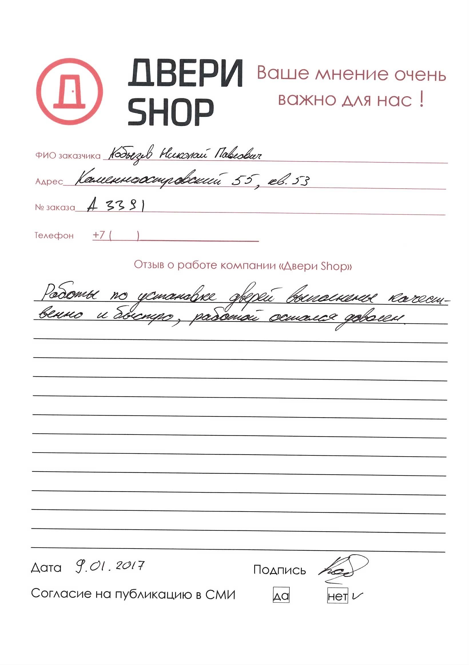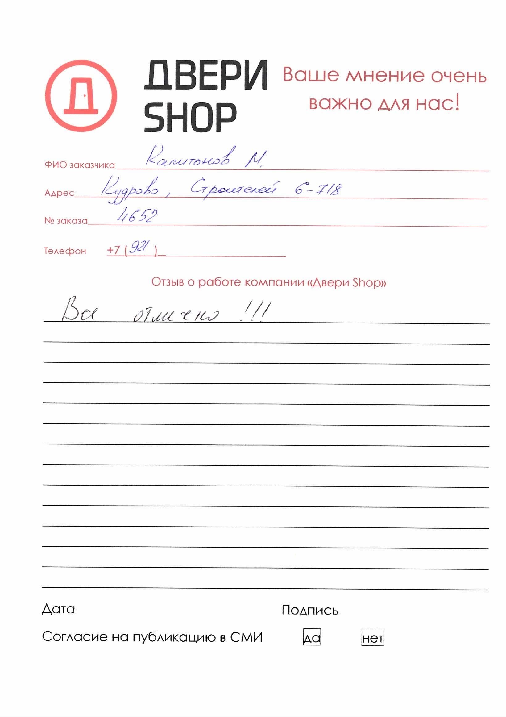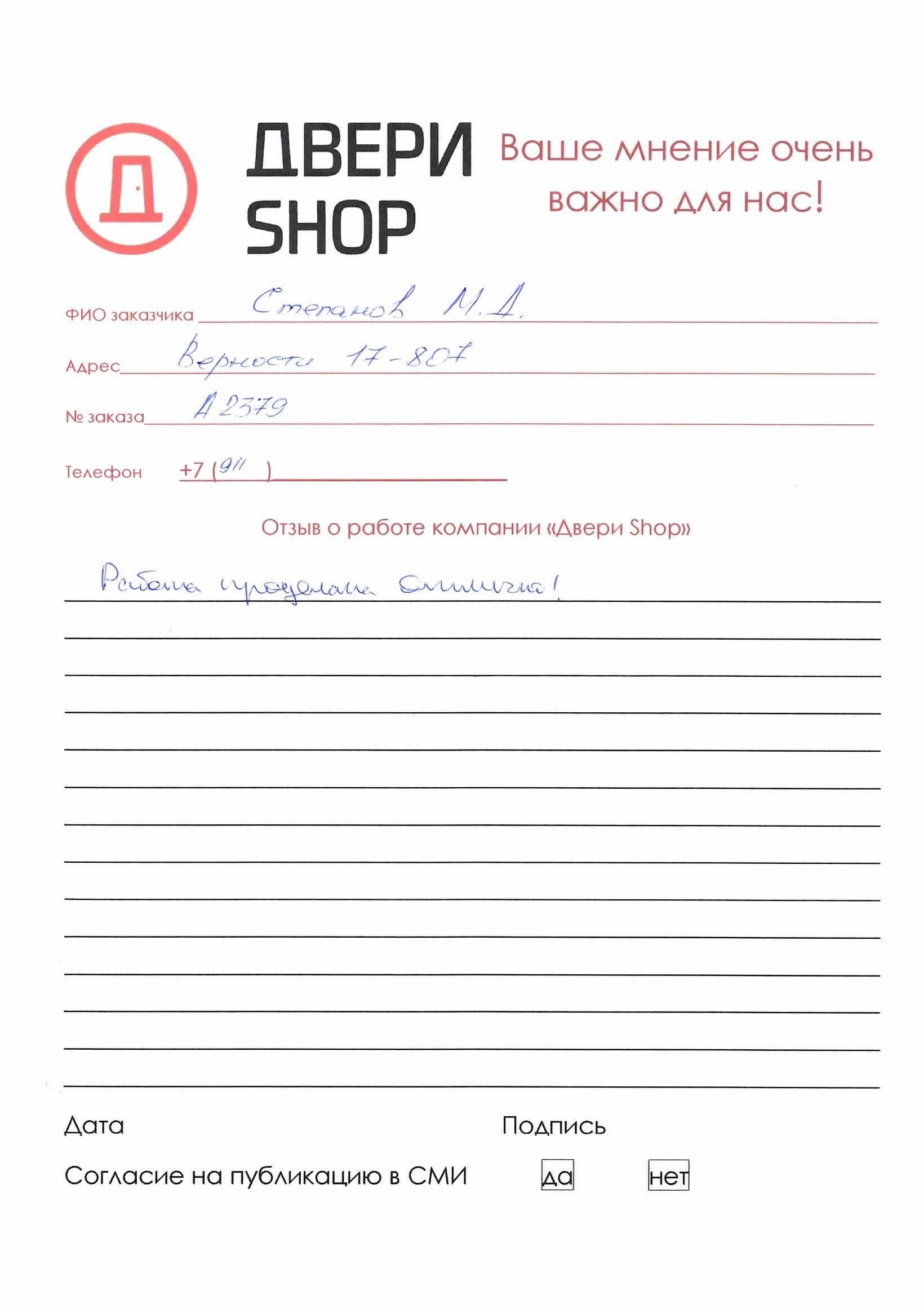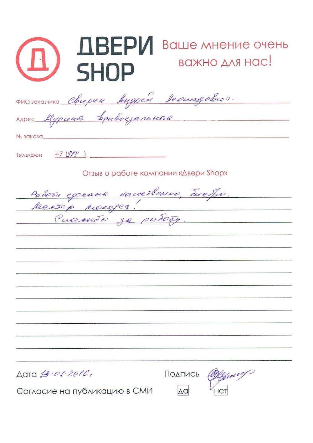 Очень понравилась работа сотрудников. Все было доставлено в срок. Отдельное спасибо мастеру по установке Денису. Установка была выполнена с наивысшим качеством, а так же Денис дал грамотные советы по дальнейшему использованию и обслуживанию. Спасибо Вам Двери Shop!!!