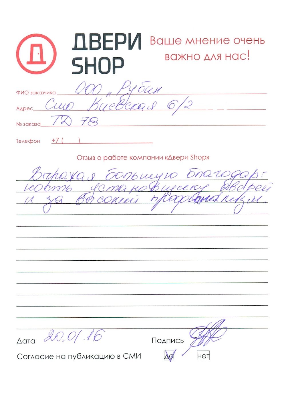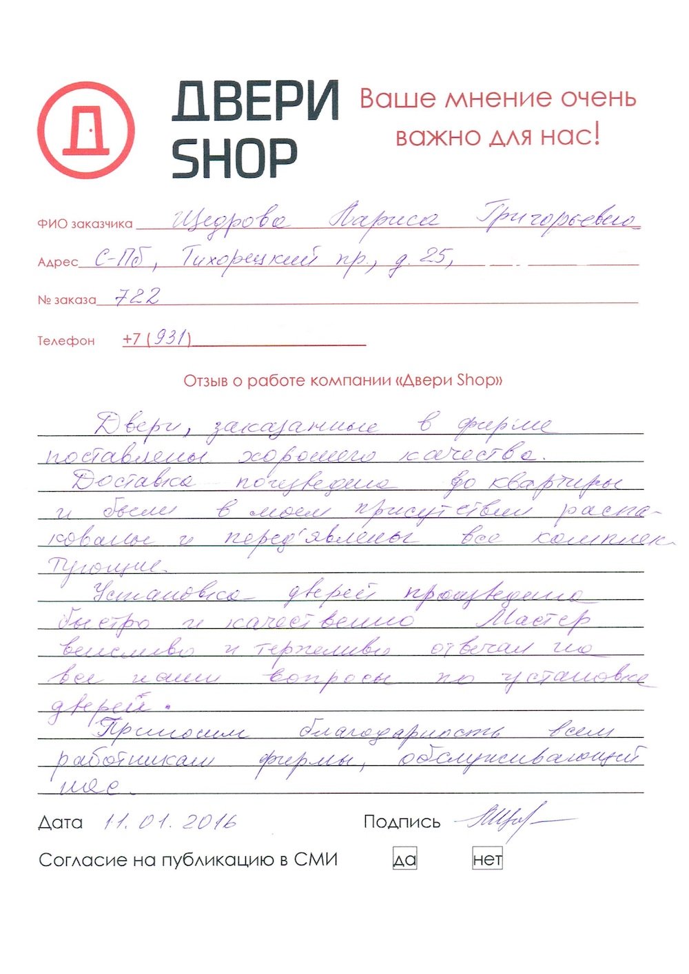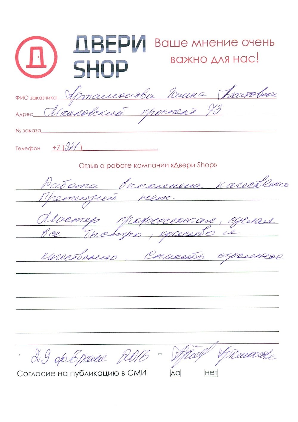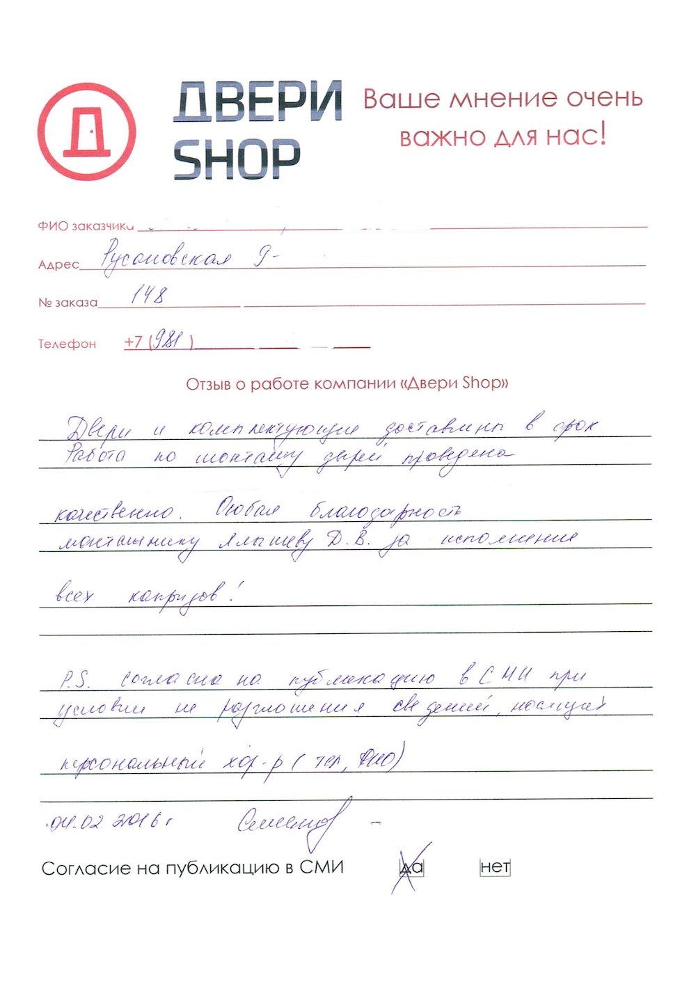 Двери и комплектующие доставлены в срок. Работа по монтажу дверей проведена качественно. Особая благодарность монтажнику Ялышеву Д.В. за исполнение всех капризов!P.S. Согласна на публикацию в СМИ при условии неразглашения сведений, носящих персональный характер (тел. Фио)