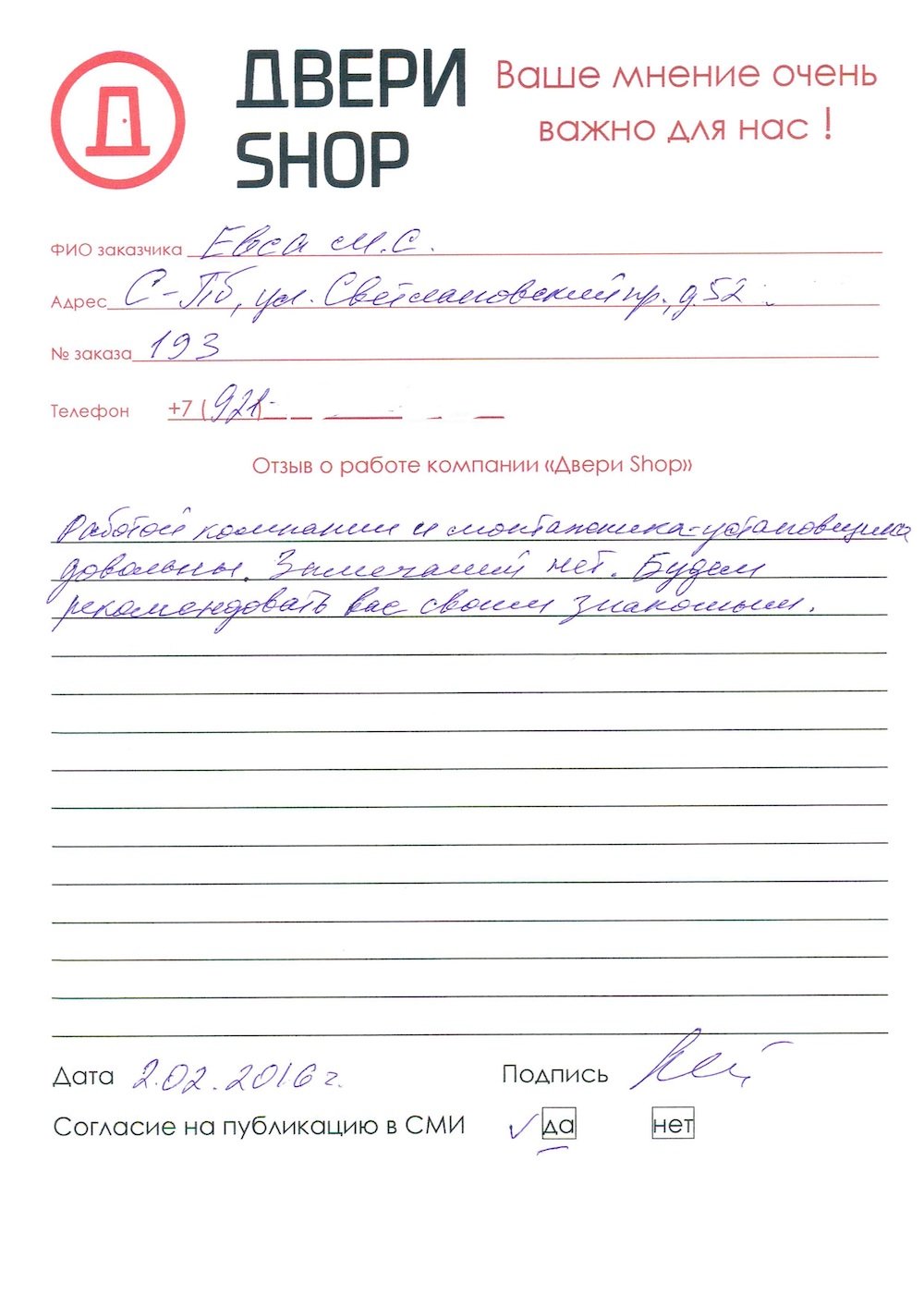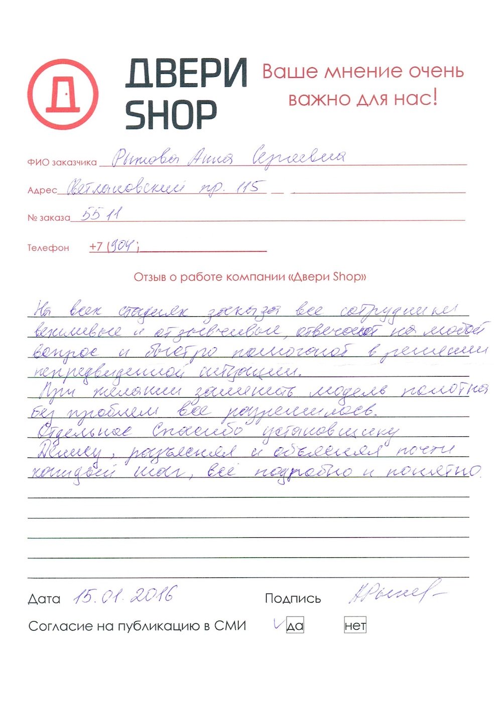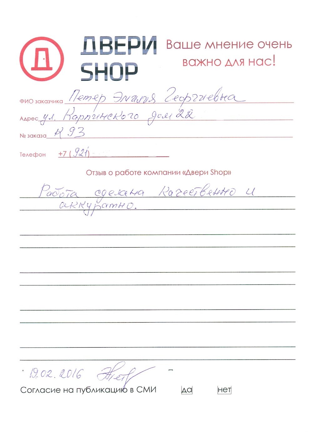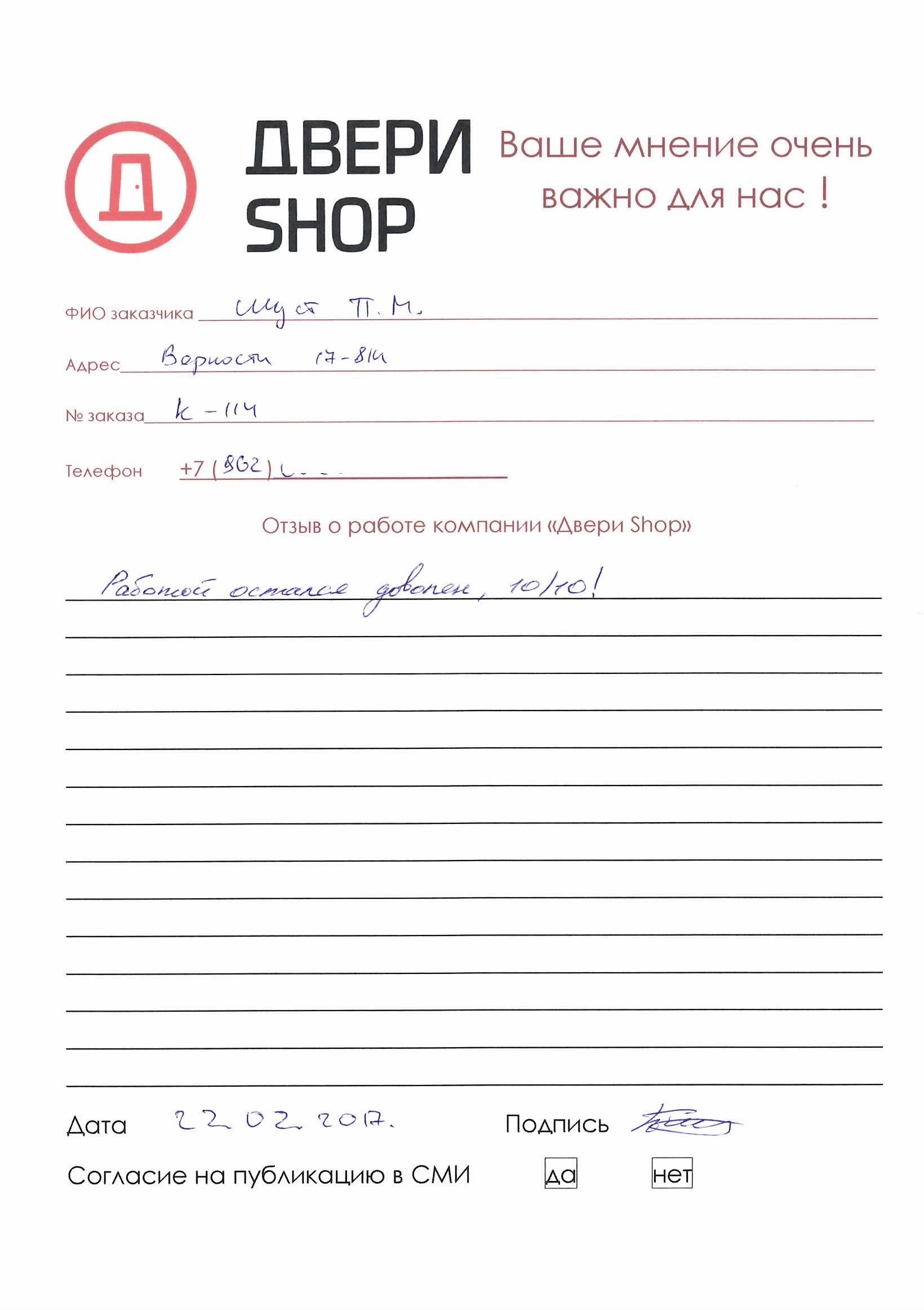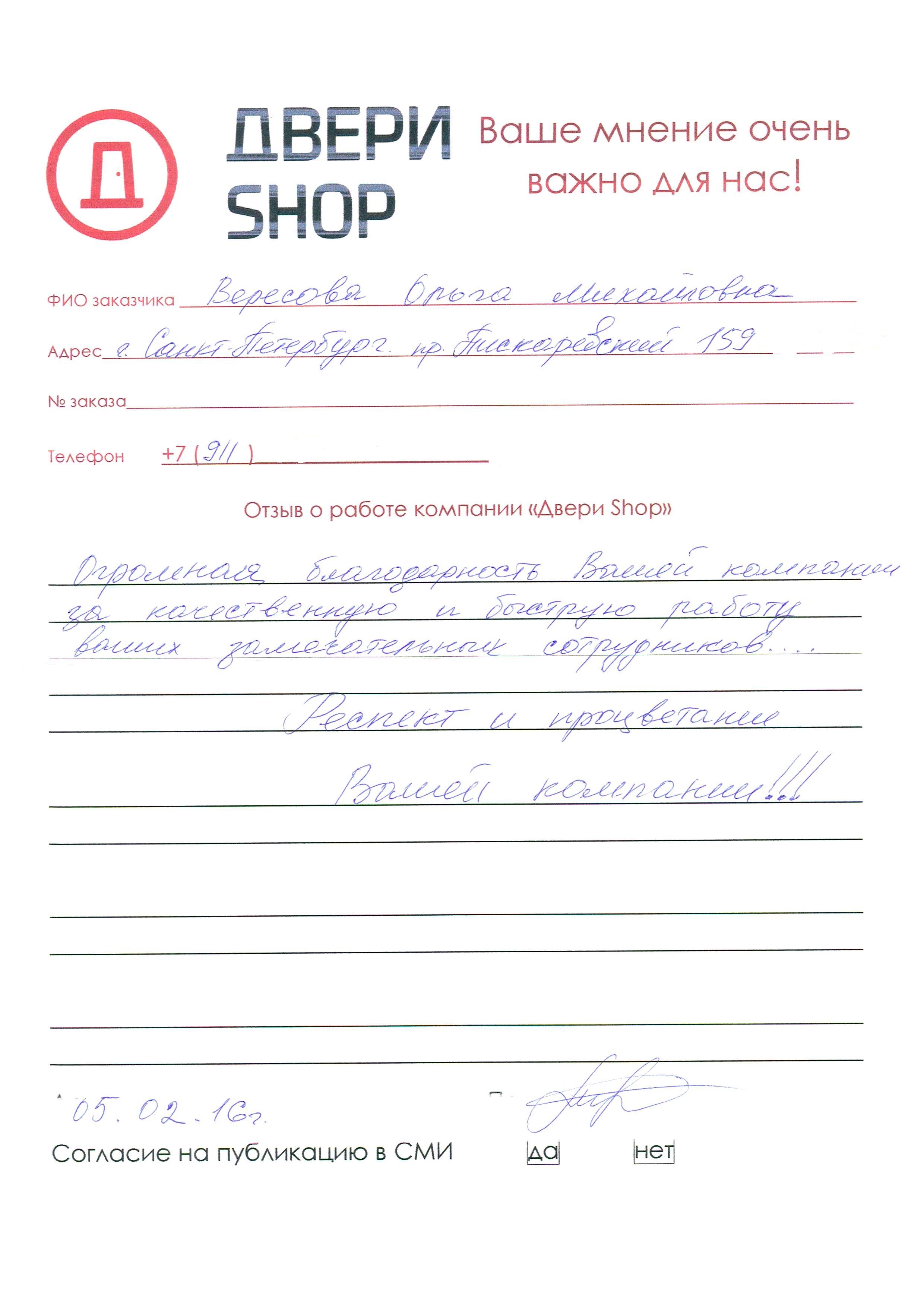Двери и комплектующие доставлены в срок. Работа по монтажу дверей проведена качественно. Особая благодарность монтажнику Ялышеву Д.В. за исполнение всех капризов!P.S. Согласна на публикацию в СМИ при условии неразглашения сведений, носящих персональный характер (тел. Фио)