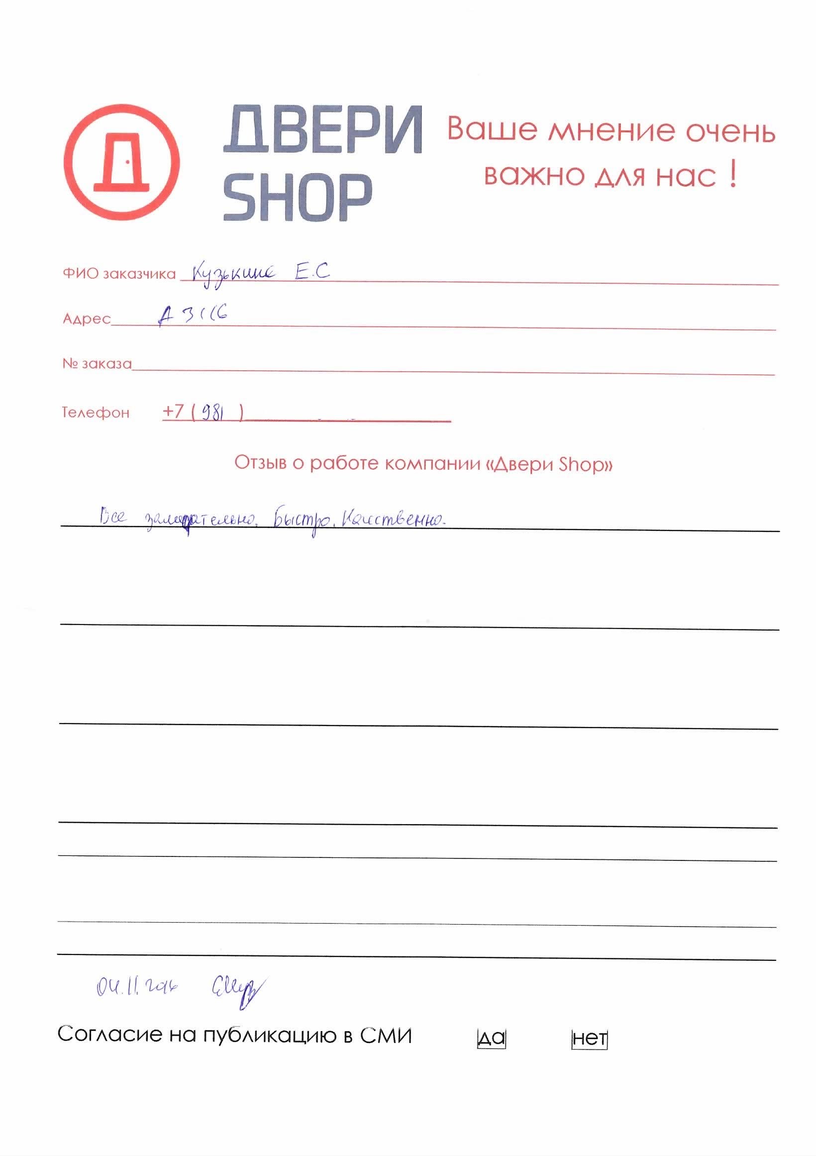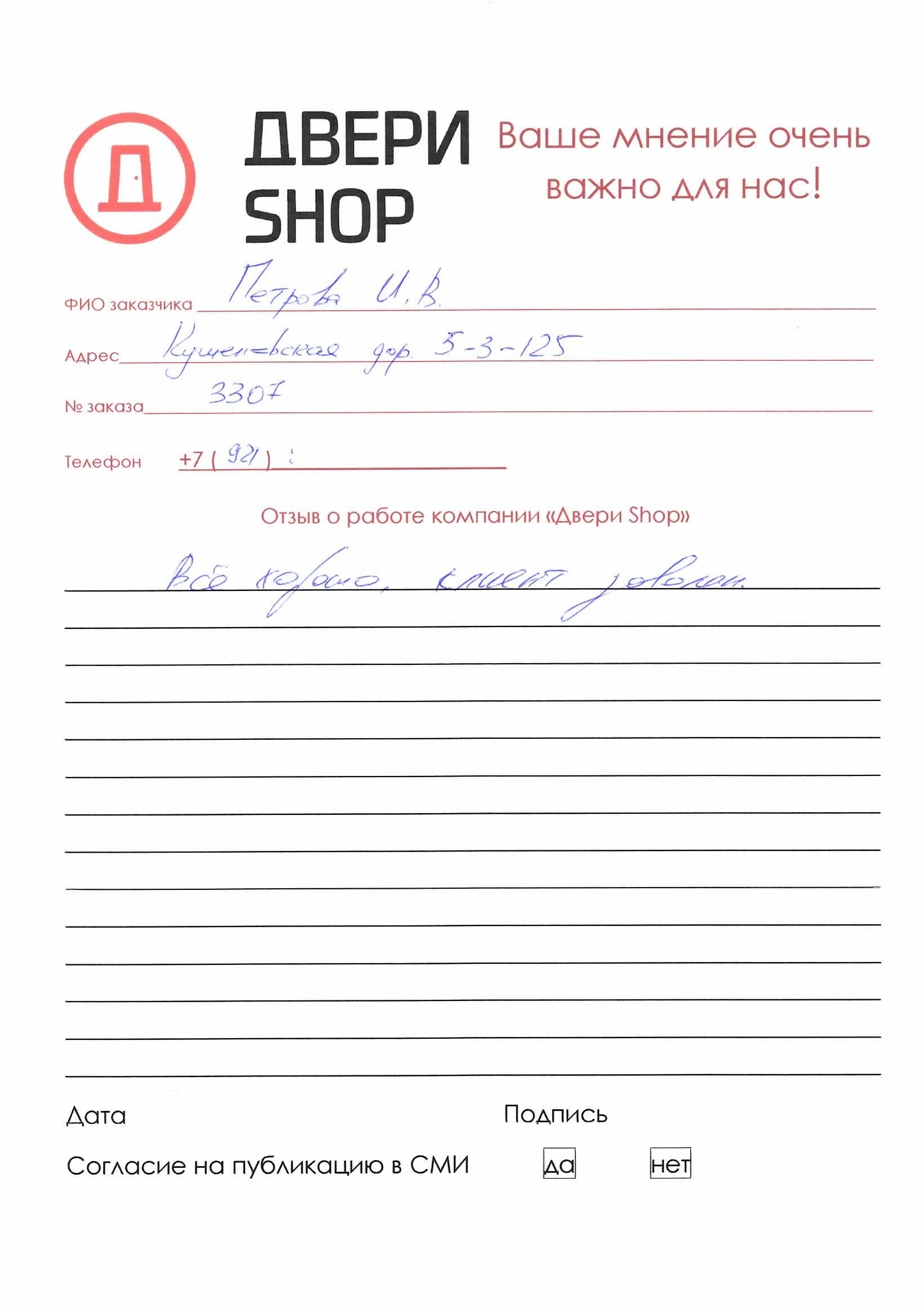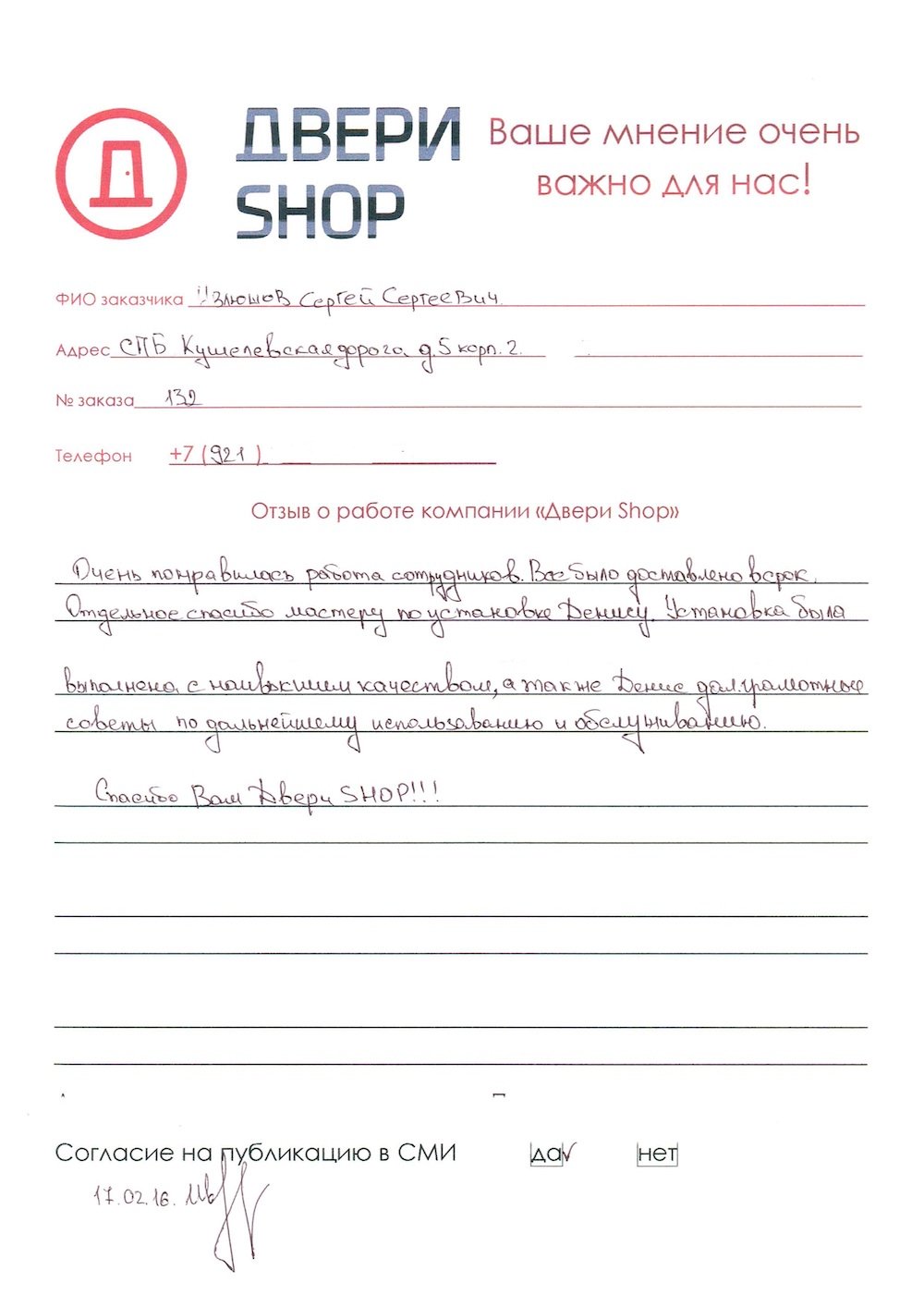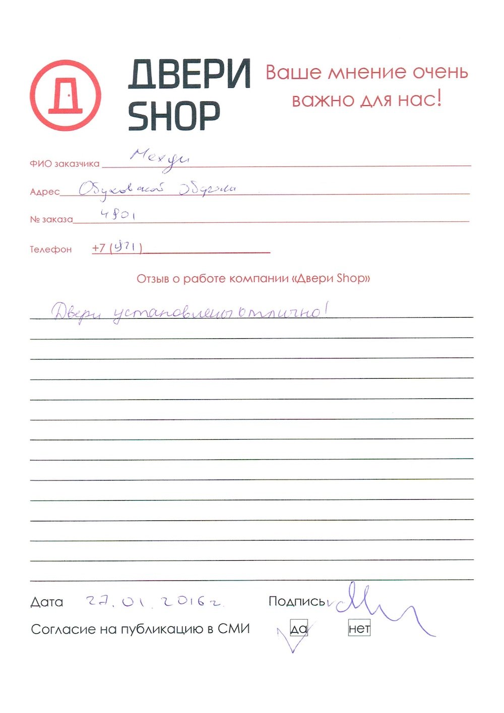 Двери и комплектующие доставлены в срок. Работа по монтажу дверей проведена качественно. Особая благодарность монтажнику Ялышеву Д.В. за исполнение всех капризов!P.S. Согласна на публикацию в СМИ при условии неразглашения сведений, носящих персональный характер (тел. Фио)