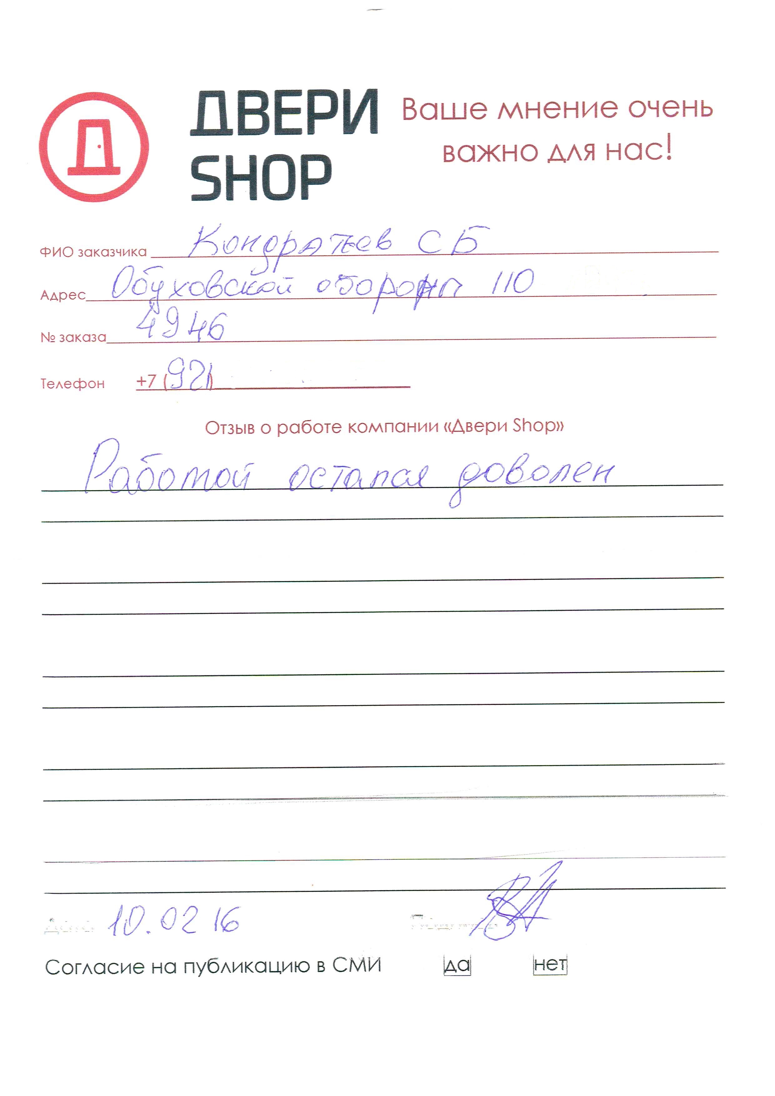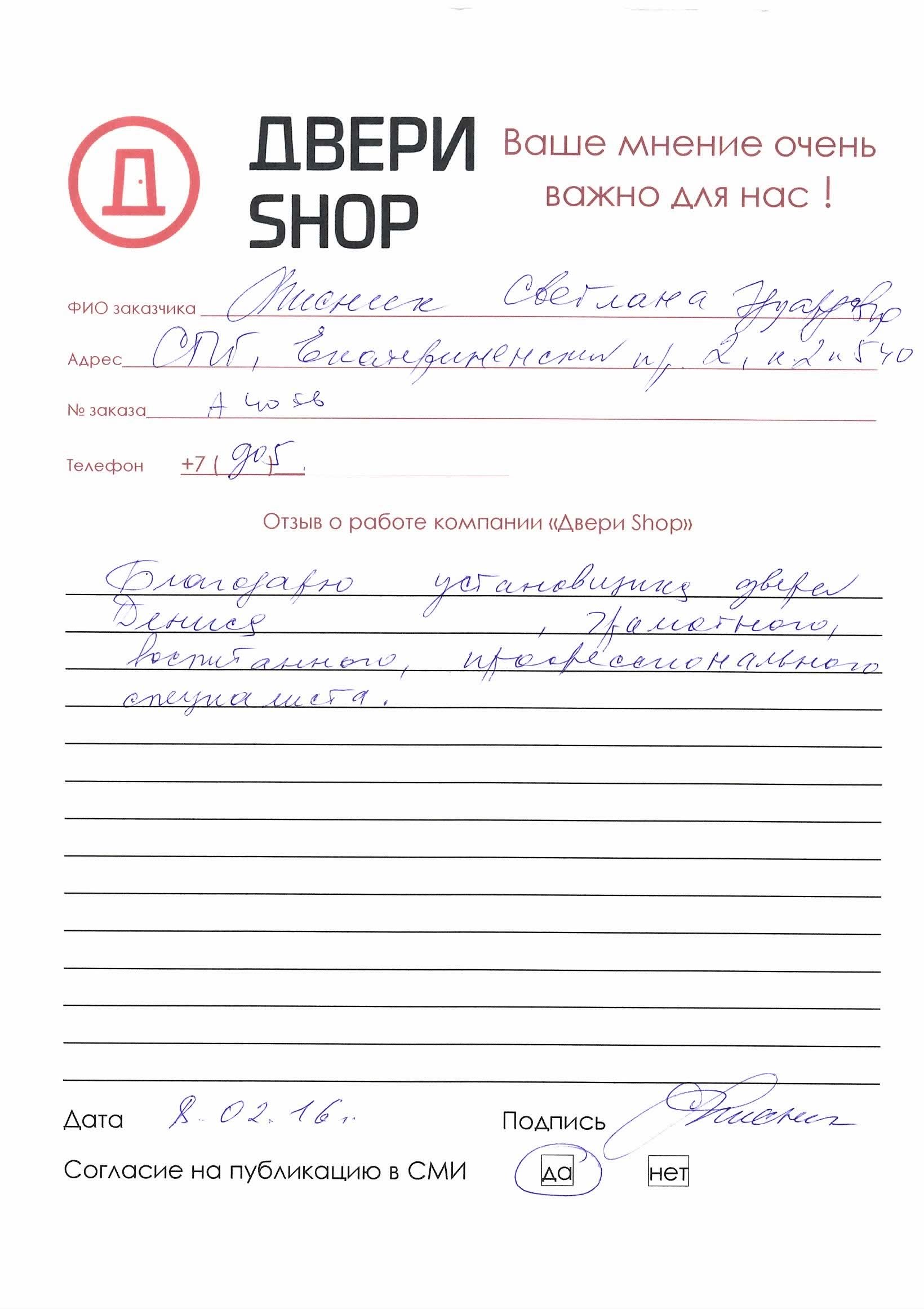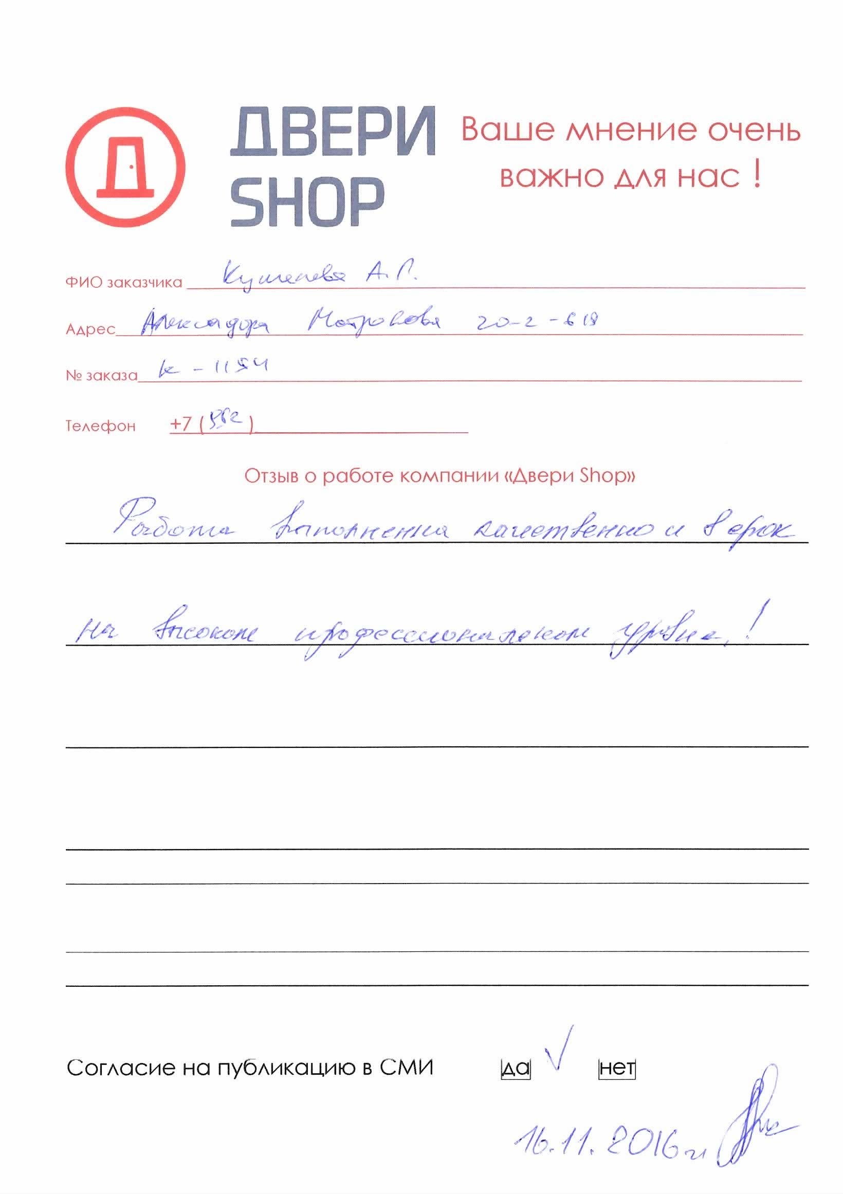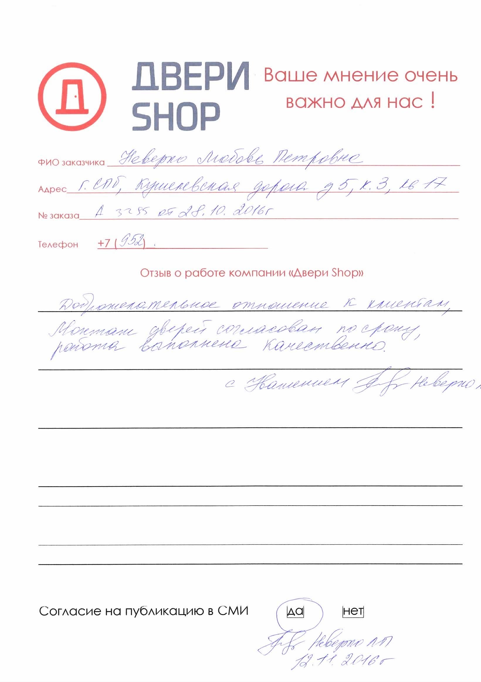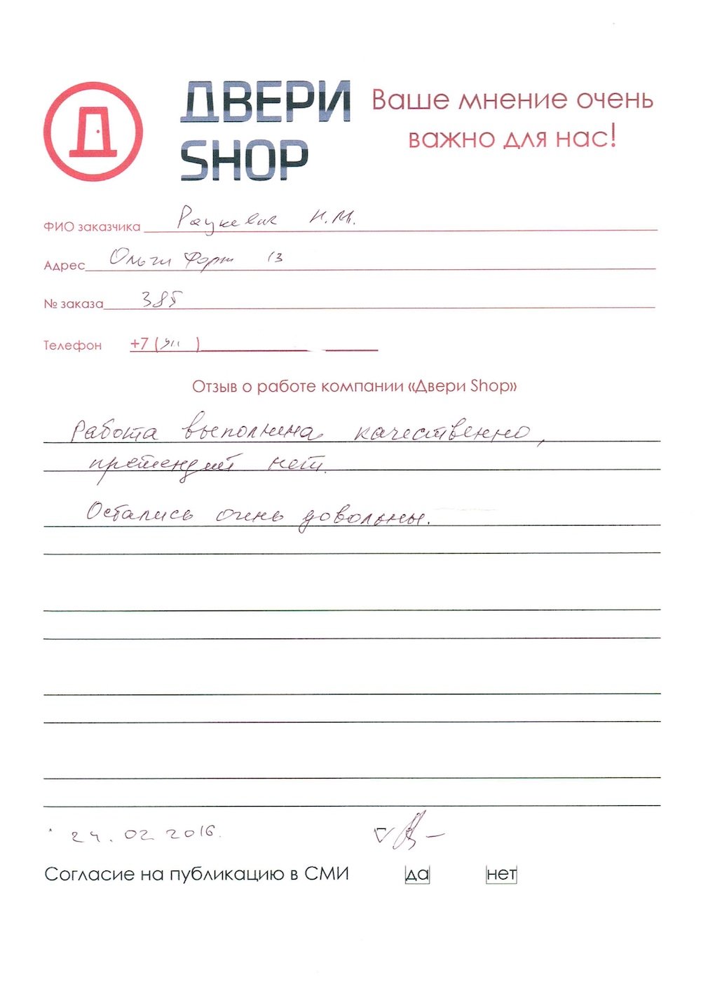 Двери и комплектующие доставлены в срок. Работа по монтажу дверей проведена качественно. Особая благодарность монтажнику Ялышеву Д.В. за исполнение всех капризов!P.S. Согласна на публикацию в СМИ при условии неразглашения сведений, носящих персональный характер (тел. Фио)