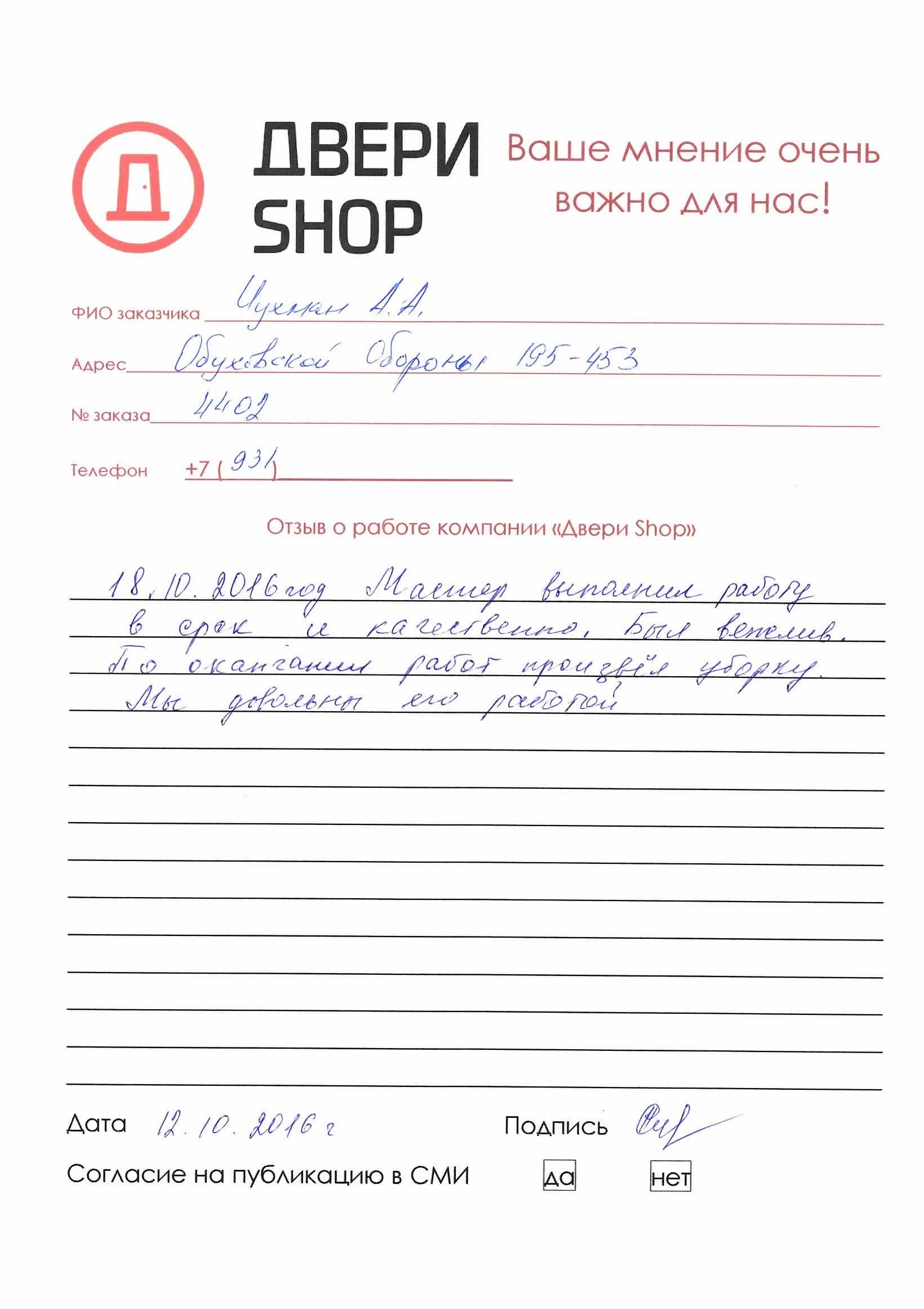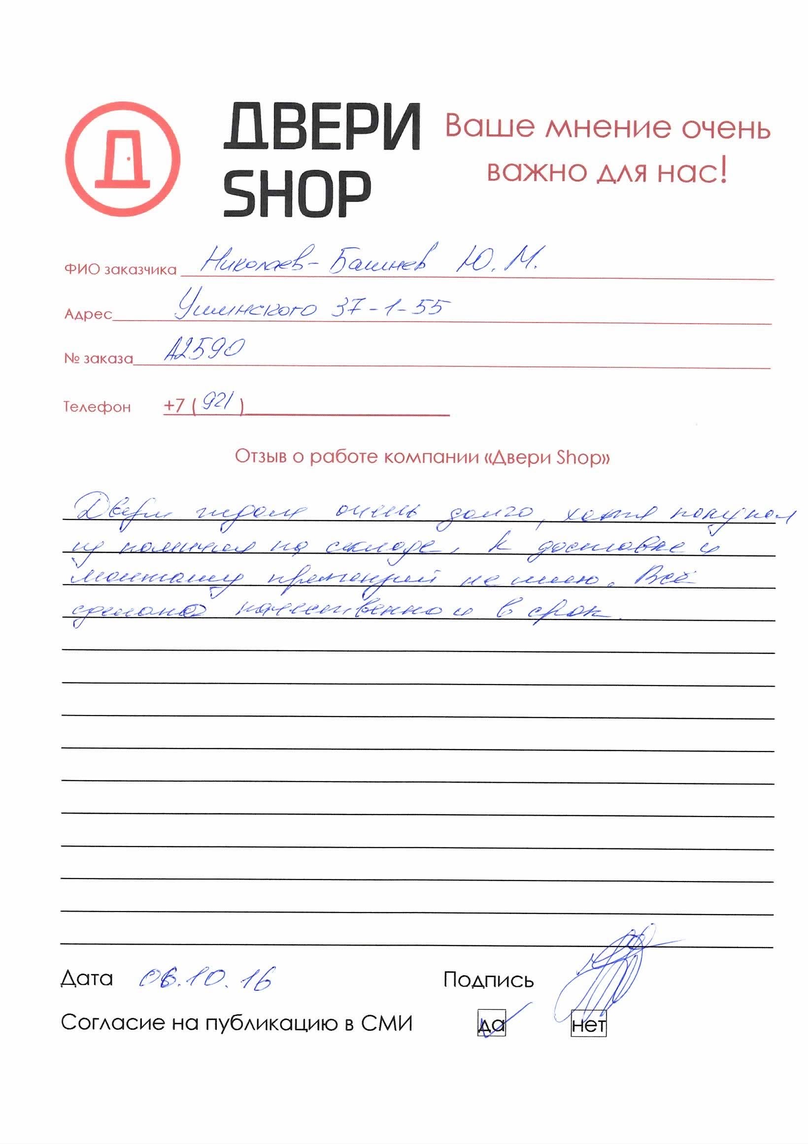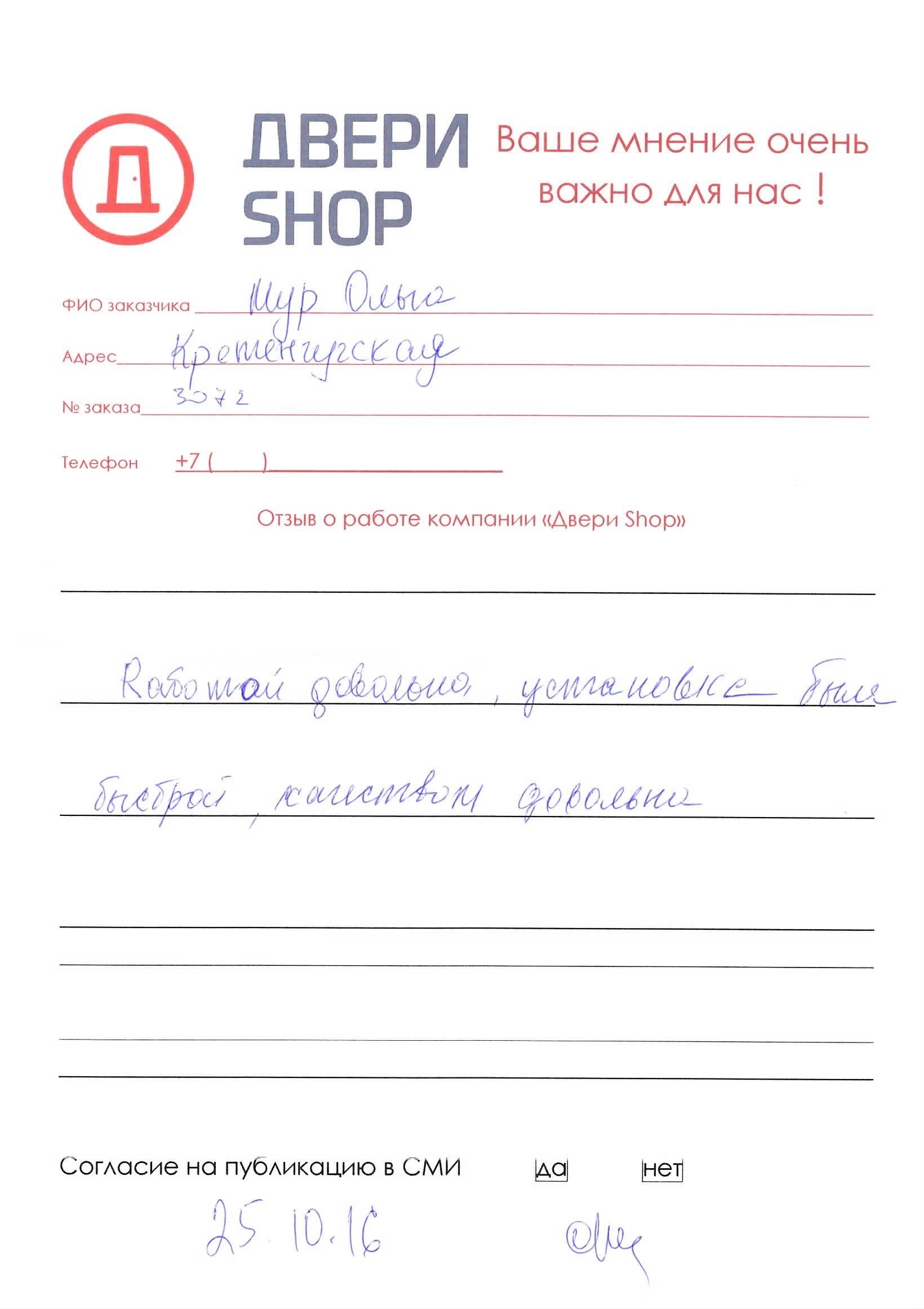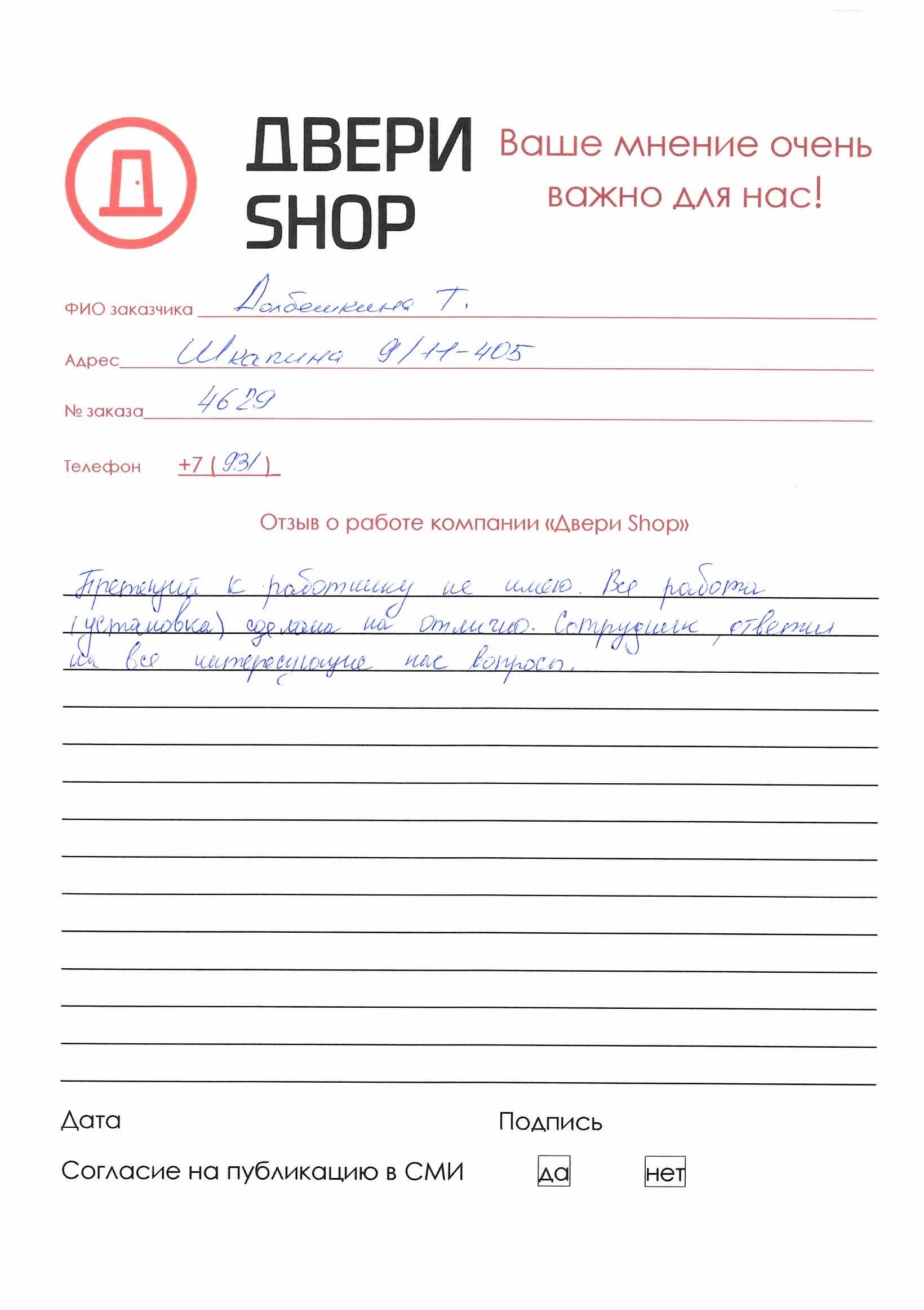Двери и комплектующие доставлены в срок. Работа по монтажу дверей проведена качественно. Особая благодарность монтажнику Ялышеву Д.В. за исполнение всех капризов!P.S. Согласна на публикацию в СМИ при условии неразглашения сведений, носящих персональный характер (тел. Фио)