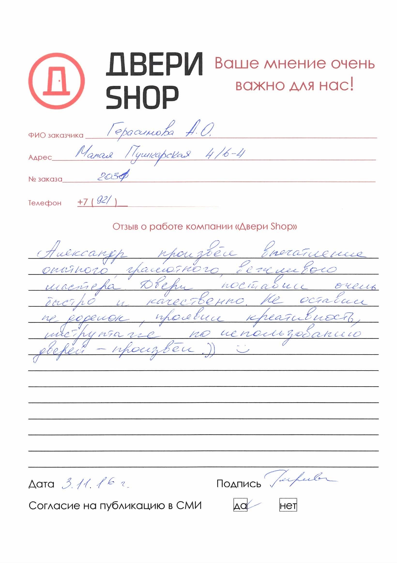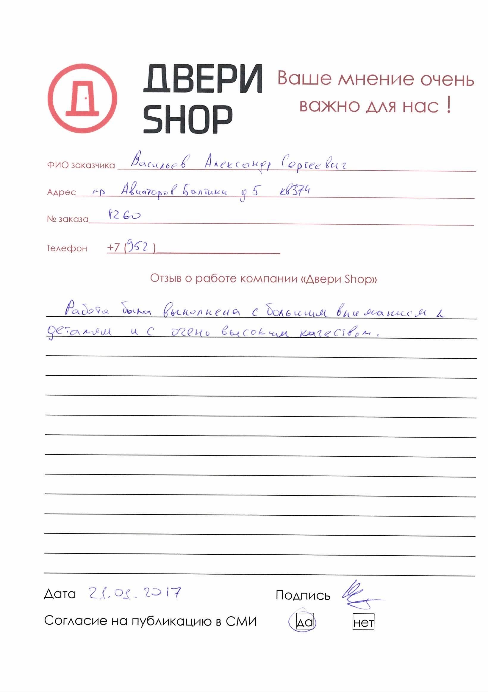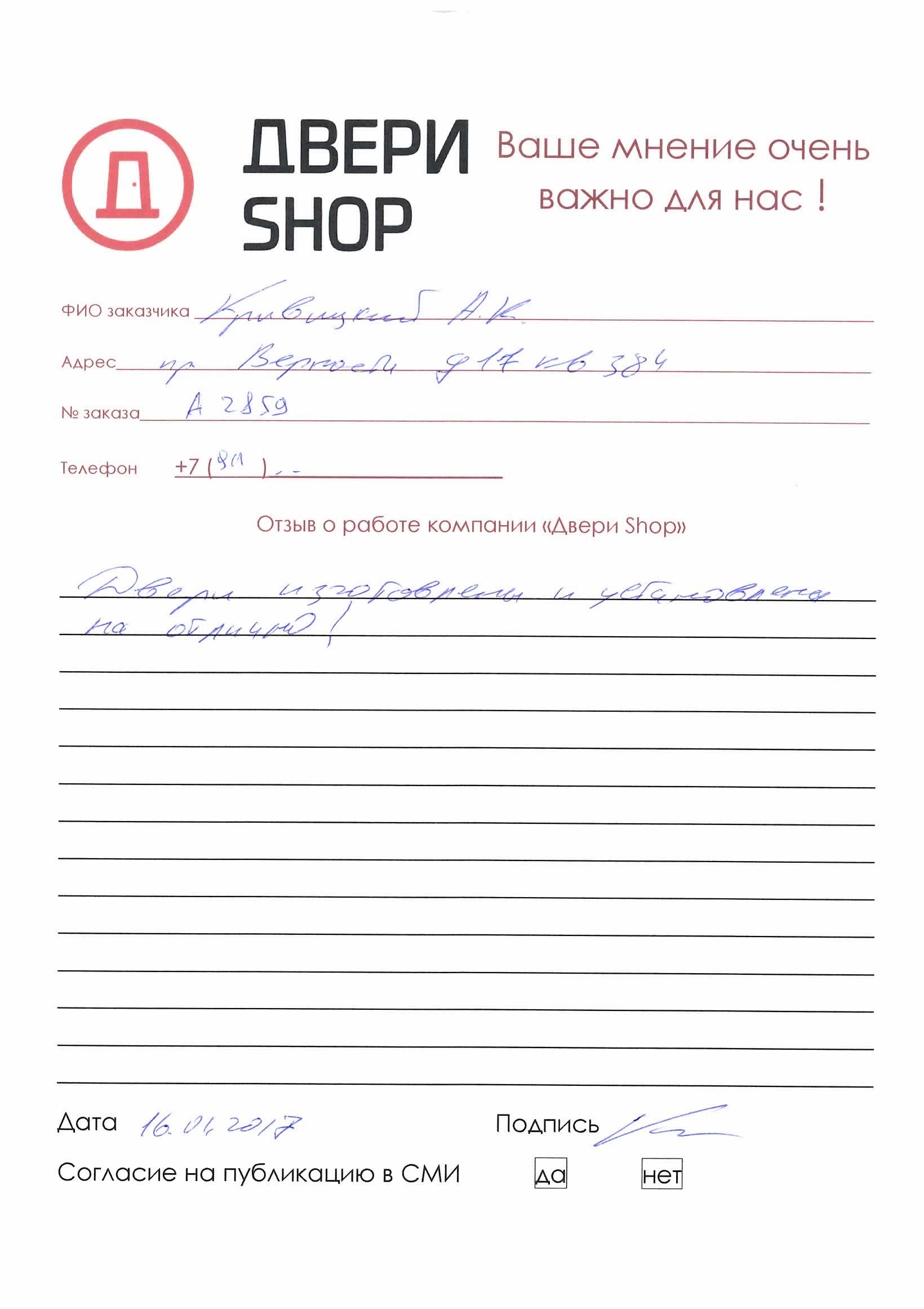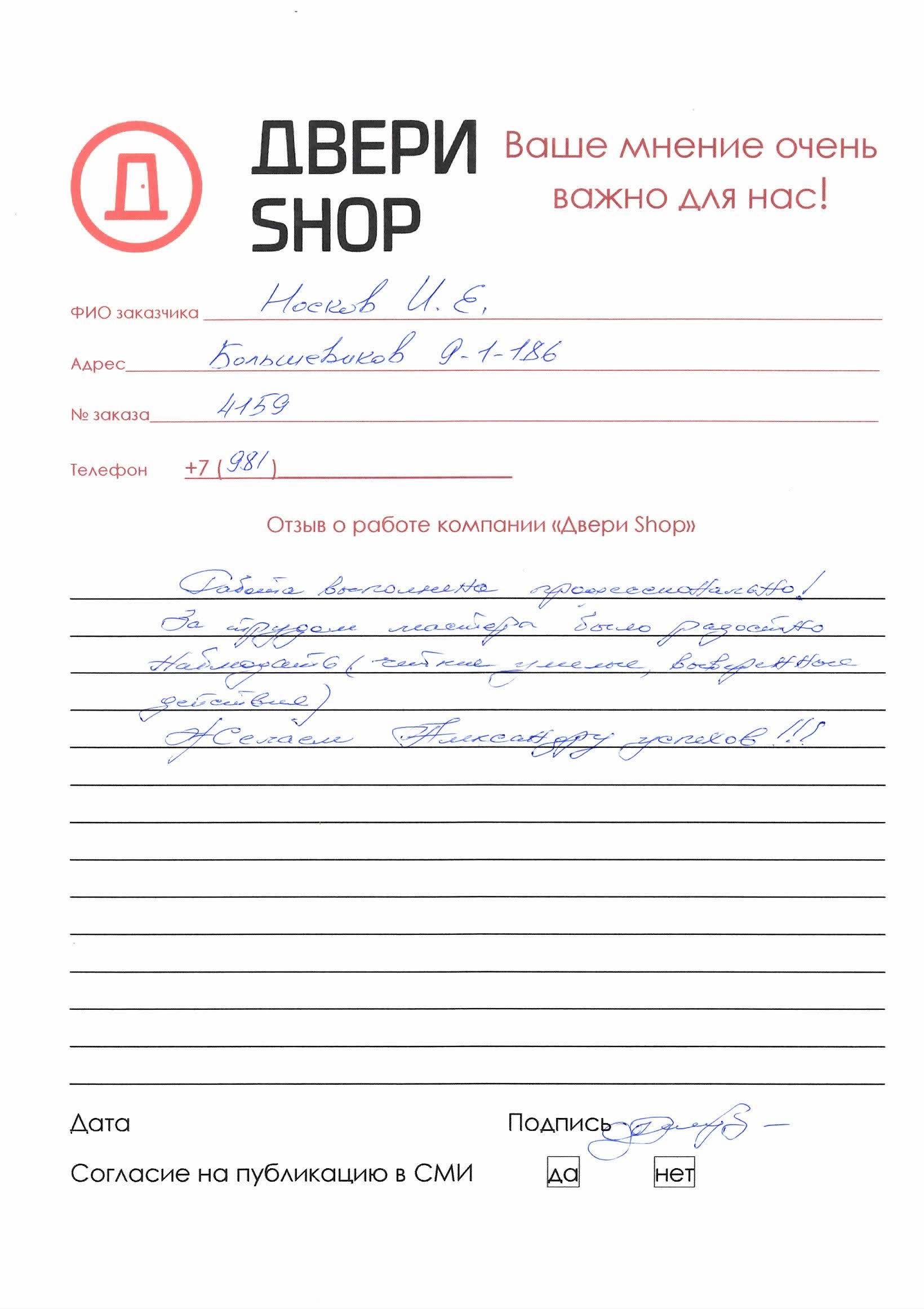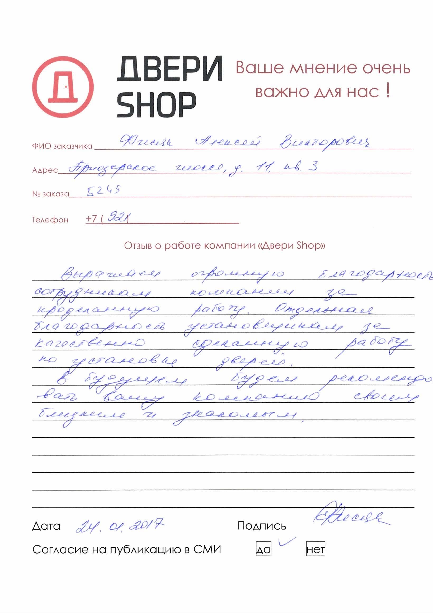 Двери и комплектующие доставлены в срок. Работа по монтажу дверей проведена качественно. Особая благодарность монтажнику Ялышеву Д.В. за исполнение всех капризов!P.S. Согласна на публикацию в СМИ при условии неразглашения сведений, носящих персональный характер (тел. Фио)