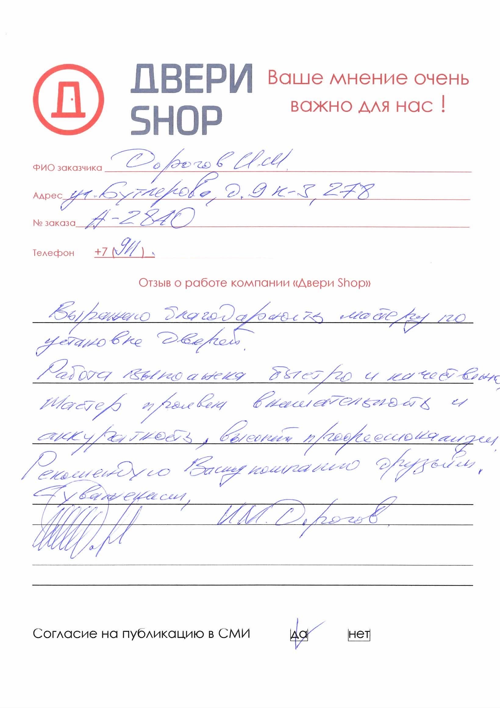 Выражаю благодарность мастеру по установке дверей. Работа выполнена быстро и качественно. Мастер проявил внимательность и аккуратность, высокий профессионализм. Рекомендую Вашу компанию друзьям. С уважением И.М. Дорогов